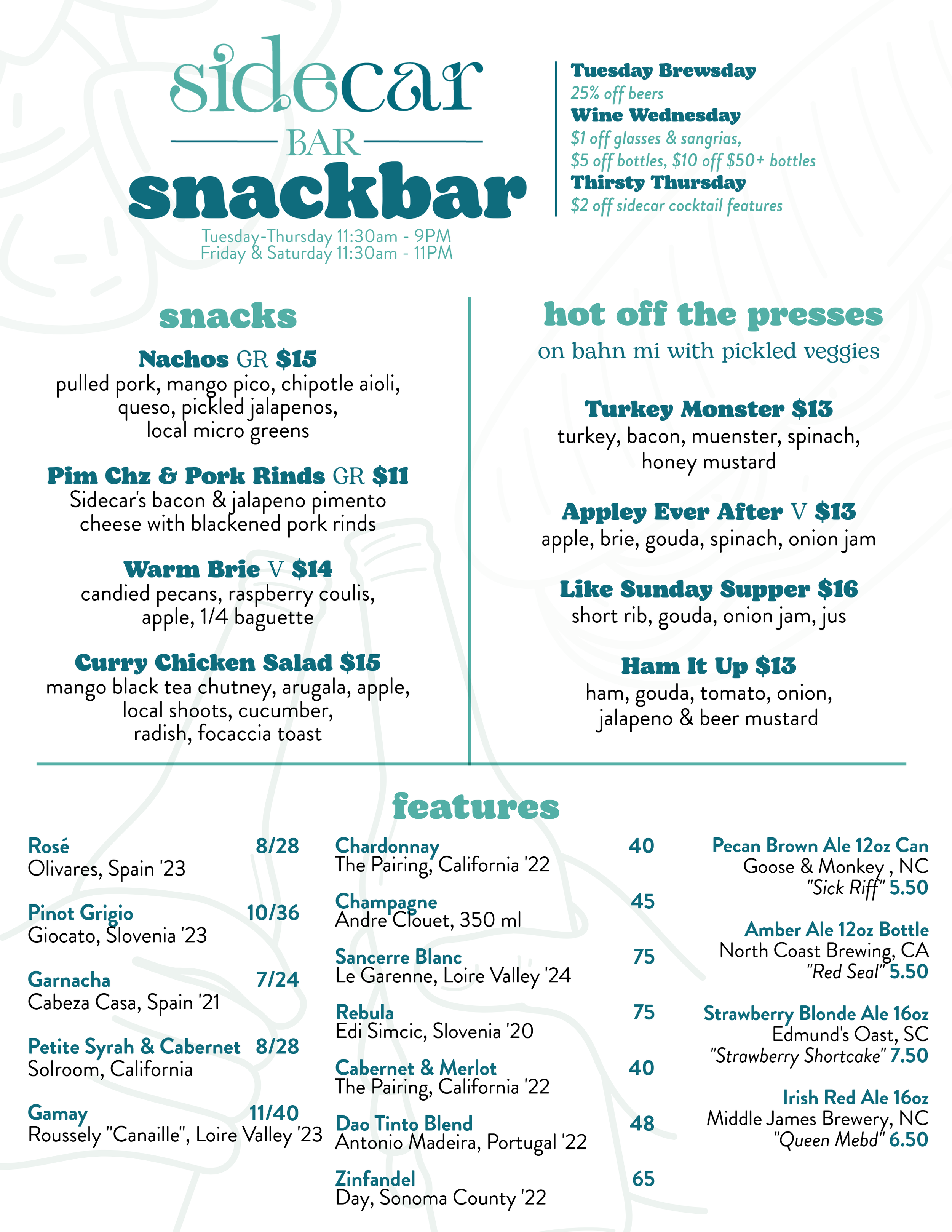 SSG 11:30pm - 8:30pm (Last Seating) Sidecar Bar til 9pm